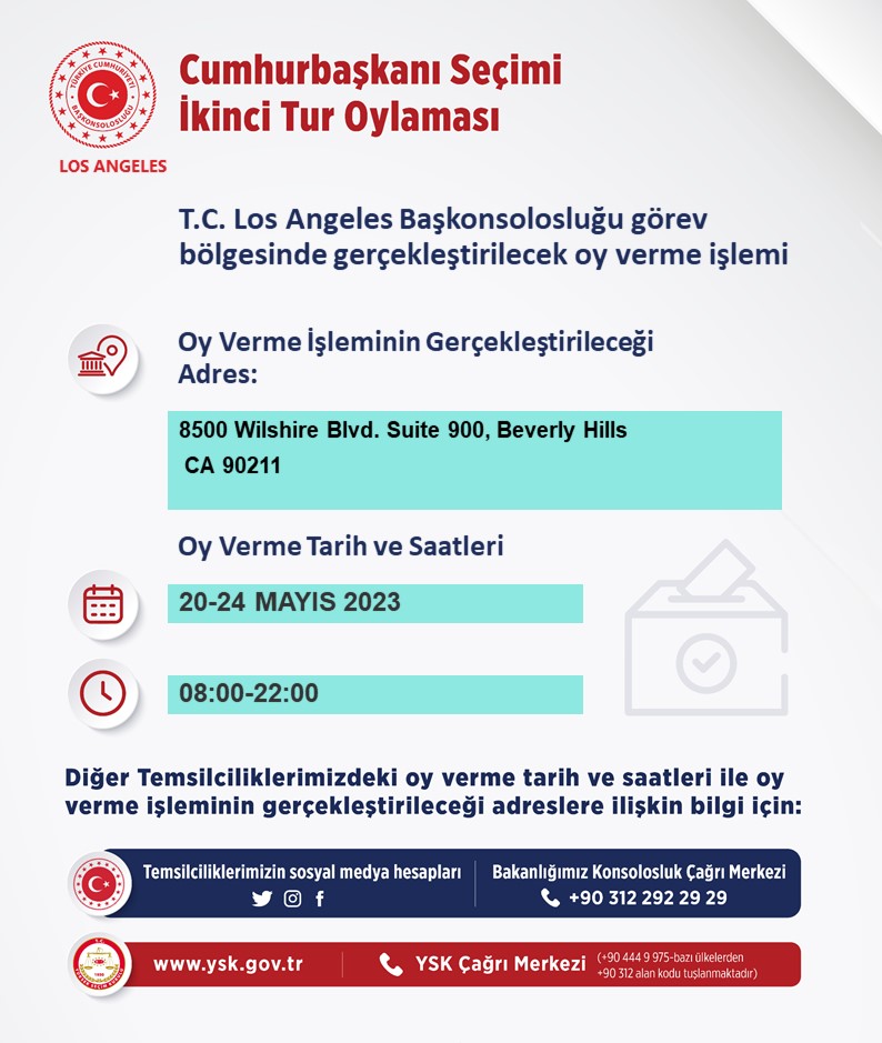 YSK’nın 16 Mayıs 2023 tarih ve 1009 sayılı kararı uyarınca, Cumhurbaşkanlığı Seçimi ikinci turu için ABD’deki diplomatik temsilciliklerimiz ve seçim merkezlerinde oy verme tarih ve saatleri yeniden düzenlenmiştir.